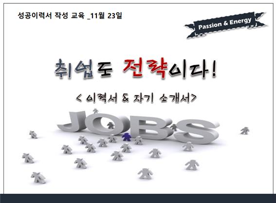 내용 : 취업을 위해 성공적인 이력서 작성방법에 대해 알아보고 취업을 위한 나만의 특별한 전략을 세워보는 시간을 가져보았습니다.