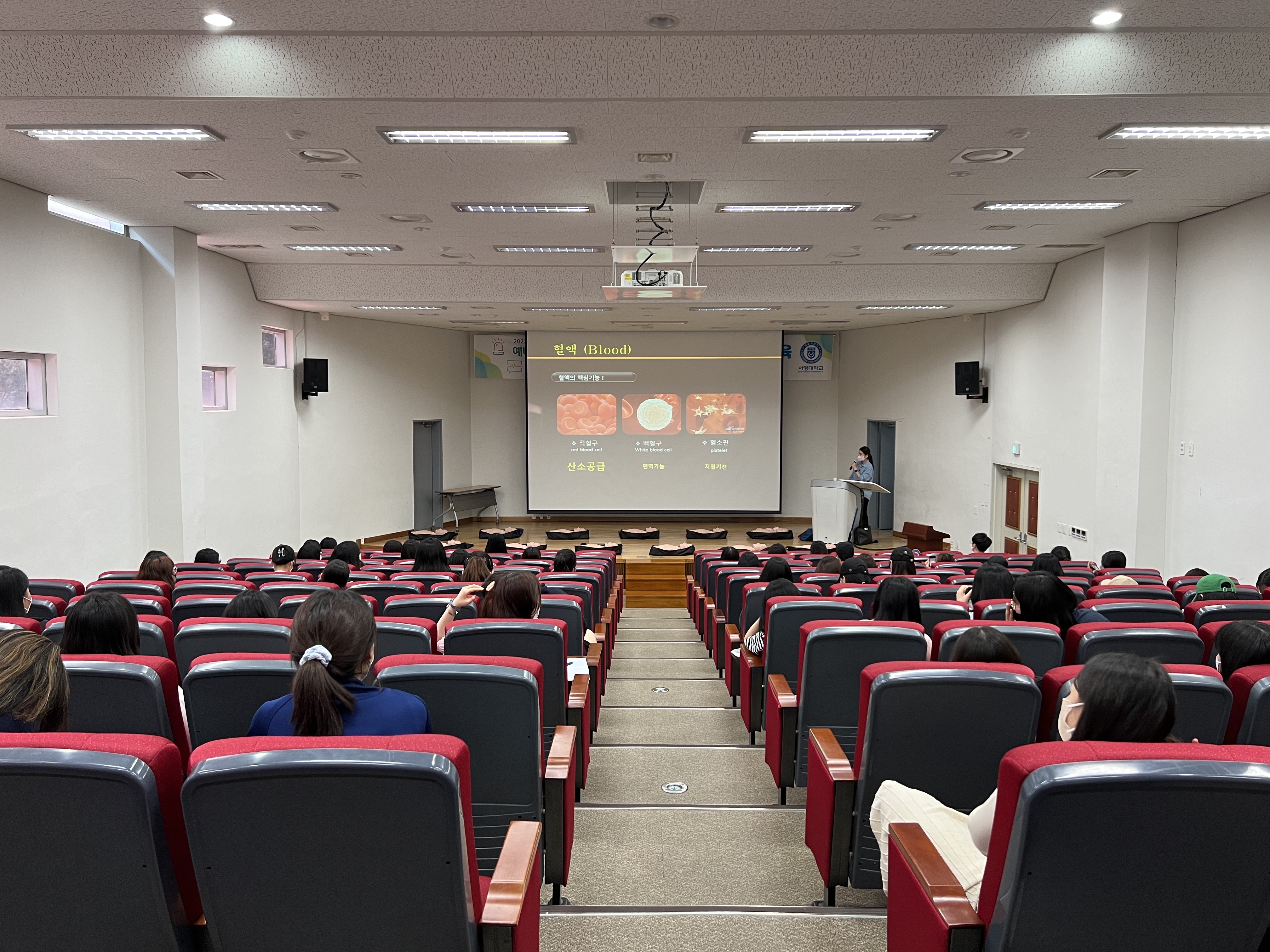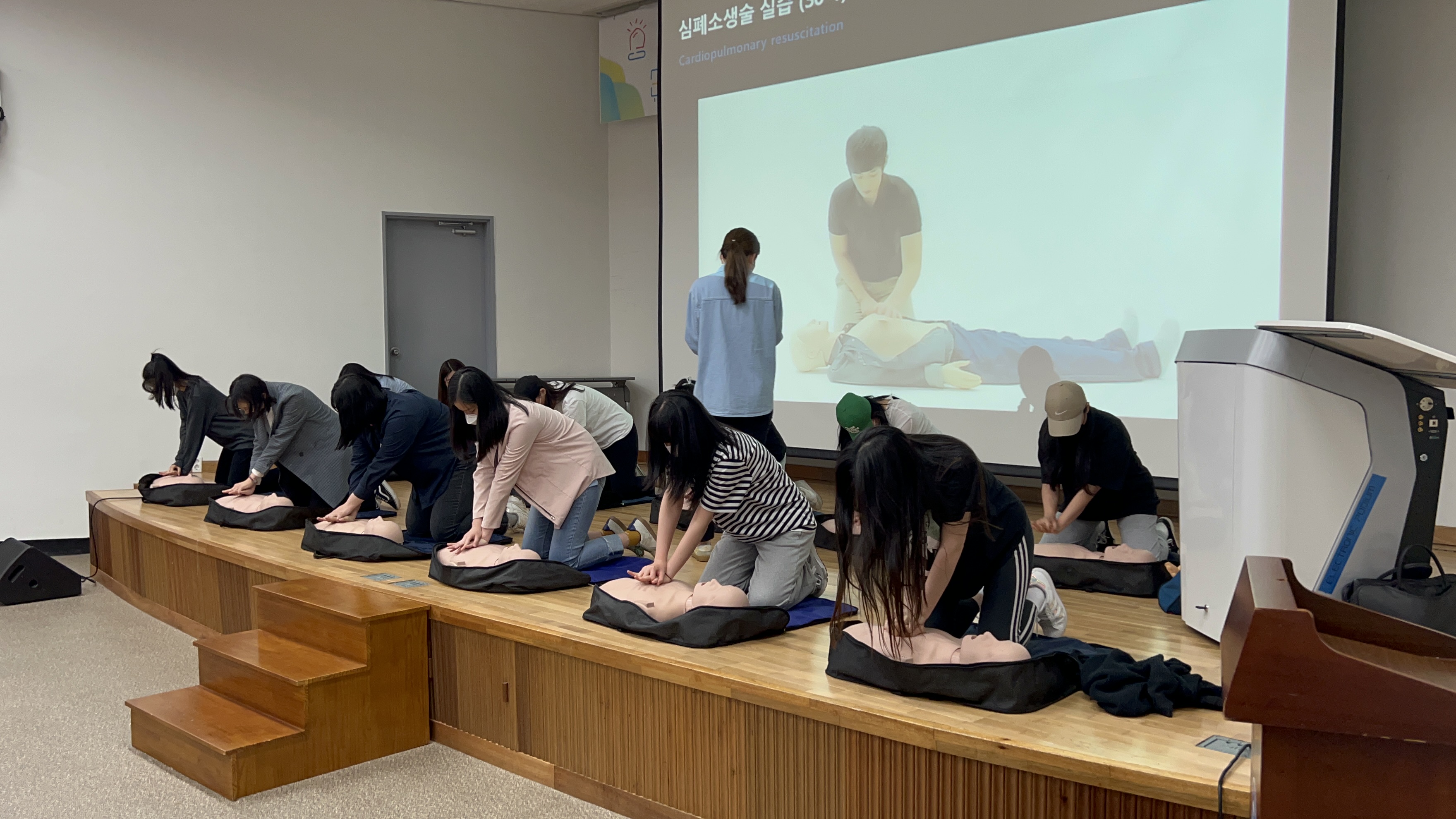 응급처치 및 심폐소생술 교육 - 일시 : 2022년 5월 17일 (화) - 강사 : 주영주 강사님 - 대상 : 유아교육과 3학년 - 장소 : 서강홀
