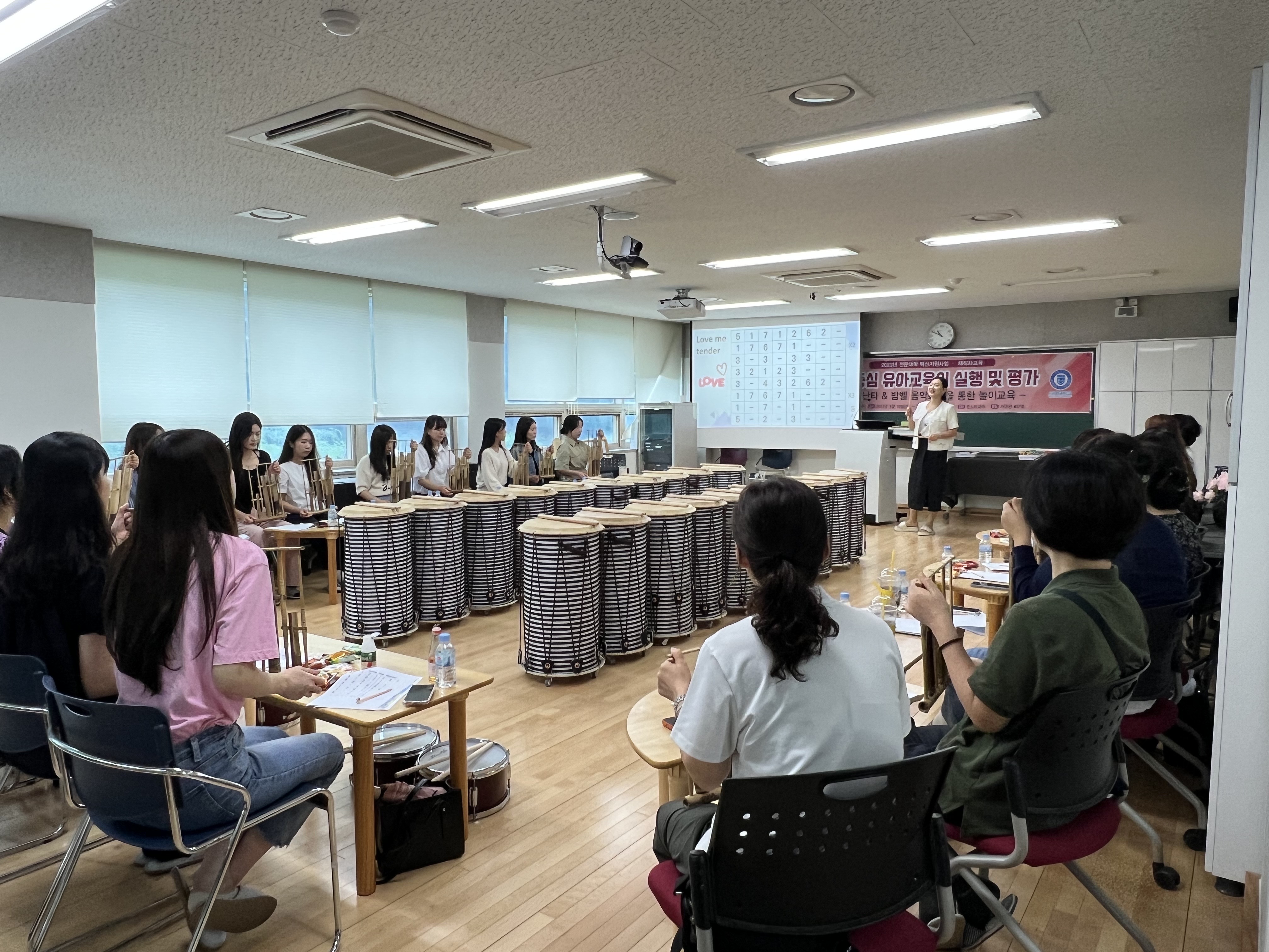 - 내용 : 9/16 (토) '놀이중심 유아교육의 실행 및 평가' 주제로 영유아교육기관 재직자들을 위한 특강을 실시하였습니다. 특강은 놀이중심 유아교육의 이론적 기초에 대한 강의를 시작으로 놀이중심 유아교육지원을 위한 음악 놀이 사례연구(유아 난타 북과 앙클루 악기를 활용한 놀이교육의 실제) 및 놀이중심 유아교육 평가법의 연구 순서로 진행되었습니다.