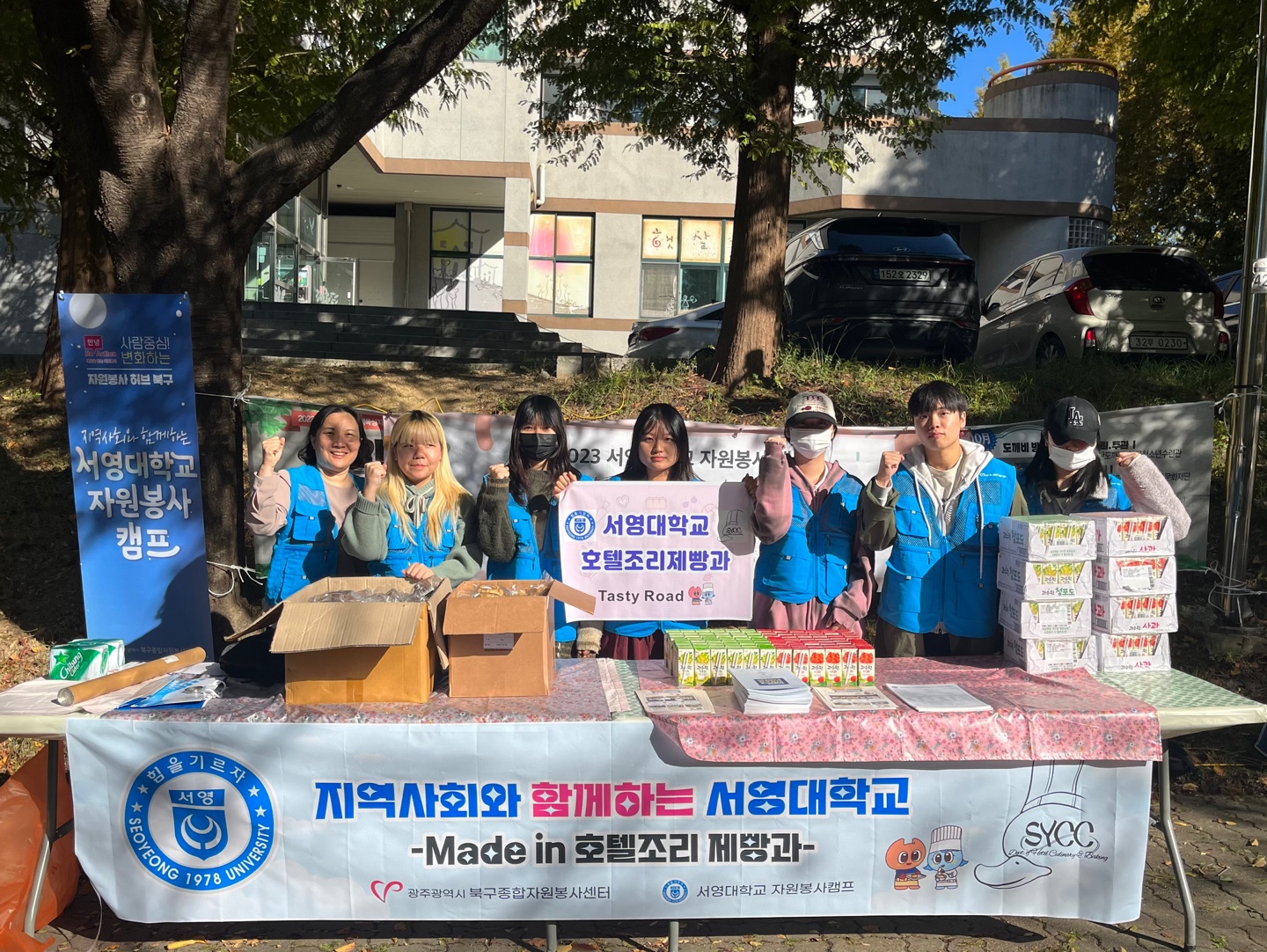 ○이날 우리대학 호텔조리제빵과 재학생들이 직접 만든 초코머핀,스모어 쿠키 등으로 구성된300개 다과 세트를 지역 주민과 청소년들에게 나눠줬다.또 호텔조리제빵과 학생들은 조리,제과제빵 등에 관심을 가진 청소년들을 대상으로 진로 상담을 펼치기도 했다.