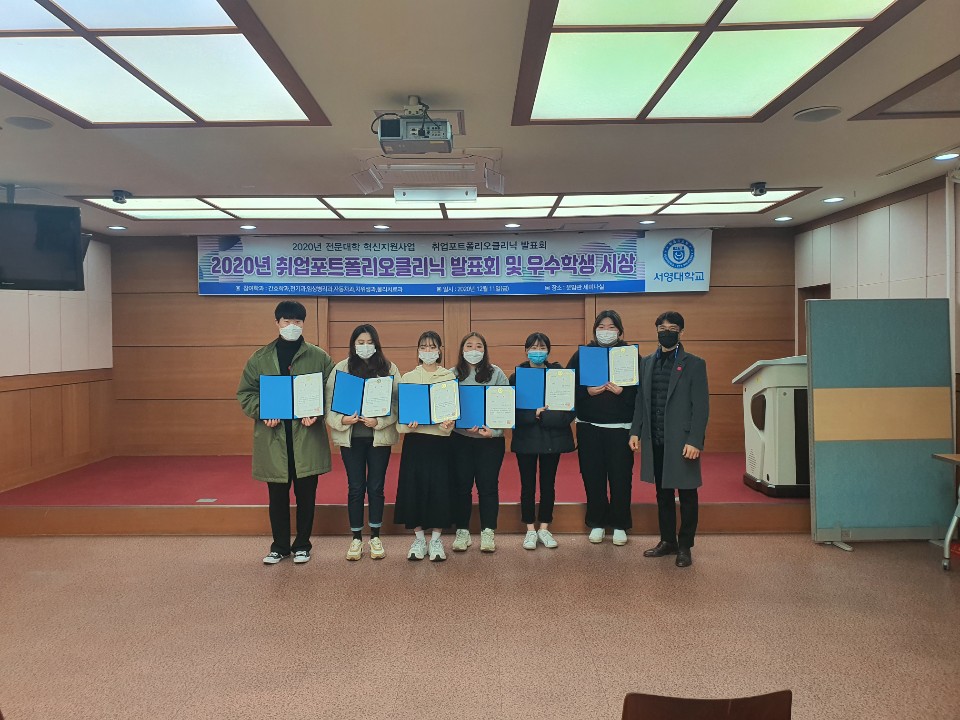 우리학교 학생취업처에서 주관하는 2020년 취업 포트폴리오클리닉 발표회 및 우수학생 시상에서 임상병리과 3학년 학생 6명이나 수상에 영예를 안았습니다