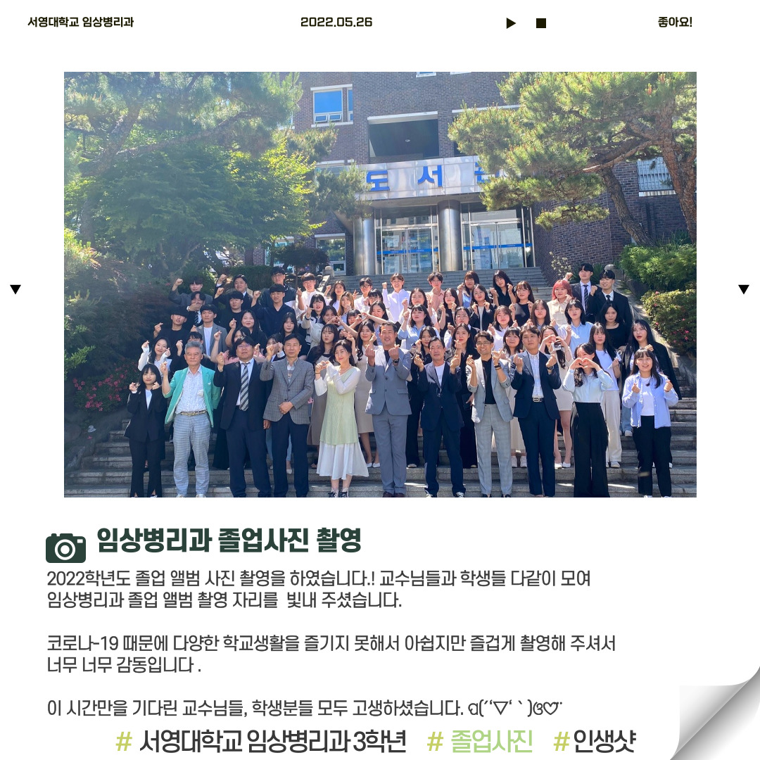 교수님들과 학생들 다 같이 모여 임상병리과 졸업 앨범 촬영 자리를 빛내 주셨습니다