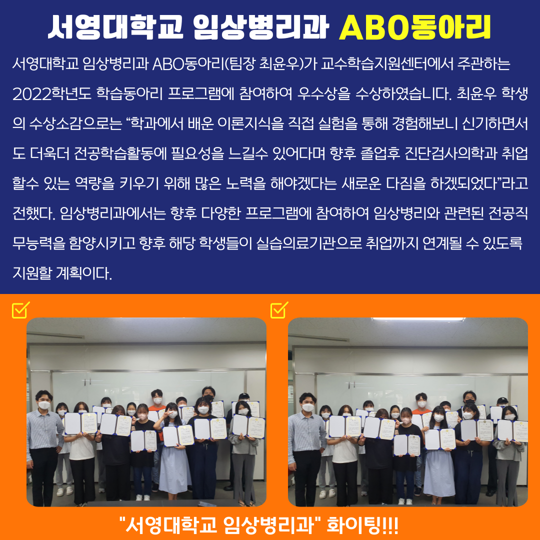 서영대학교 임상병리과ABO동아리 서영대학교 임상병리과ABO동아리(팀장 최윤우)가 교수학습지원센터에서 주관하는2022학년도 학습동아리 프로그램에 참여하여 우수상을 수상하였습니다.최윤우 학생의 수상소감으로는“학과에서 배운 이론지식을 직접 실험을 통해 경험해보니 신기하면서도 더욱더 전공학습활동에 필요성을 느길수 있어다며 향후 졸업후 진단검사의학과 취업할수 있는 역량을 키우기 위해 많은 노력을 해야겠다는 새로운 다짐을 하겠되었다”라고 전했다.임상병리과에서는 향후 다양한 프로그램에 참여하여 임상병리와 관련된 전공직무능력을 함양시키고 향후 해당 학생들이 실습의료기관으로 취업까지 연계될 수 있도록 지원할 계획이다.
