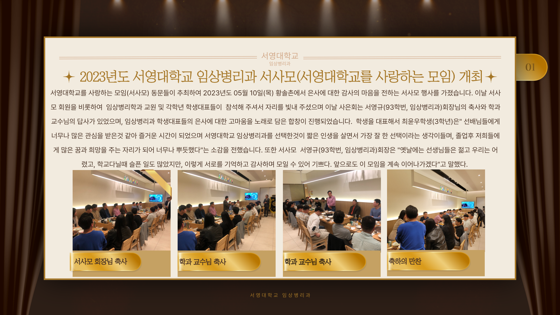 서영대학교를 사랑하는 모임(서사모) 동문들이 추최하여 2023년도 05월 10일(목) 황솔촌에서 은사에 대한 감사의 마음을 전하는 서사모 행사를 가졌습니다. 이날 서사모 회원을 비롯하여  임상병리학과 교원 및 각학년 학생대표들이  참석해 주셔서 자리를 빛내 주셨으며 이날 사은회는 서영규(94학번, 임상병리과)회장님의 축사와 학과교수님의 답사가 있었으며, 임상병리과 학생대표들의 은사에 대한 고마움을 노래로 담은 합창이 진행되었습니다.  학생을 대표해서 최윤우학생(3학년)은" 선배님들에게 너무나 많은 관심을 받은것 같아 즐거운 시간이 되었으며 서영대학교 임상병리과를 선택한것이 짧은 인생을 살면서 가장 잘 한 선택이라는 생각이들며, 졸업후 저희들에게 많은 꿈과 희망을 주는 자리가 되어 너무나 뿌듯했다"는 소감을 전했습니다. 또한 서사모  서영규(94학번, 임상병리과)회장은 "옛날에는 선생님들은 젊고 우리는 어렸고, 학교다닐때 슬픈 일도 많았지만, 이렇게 서로를 기억하고 감사하며 모일 수 있어 기쁘다. 앞으로도 이 모임을 계속 이어나가겠다"고 말했습니다.