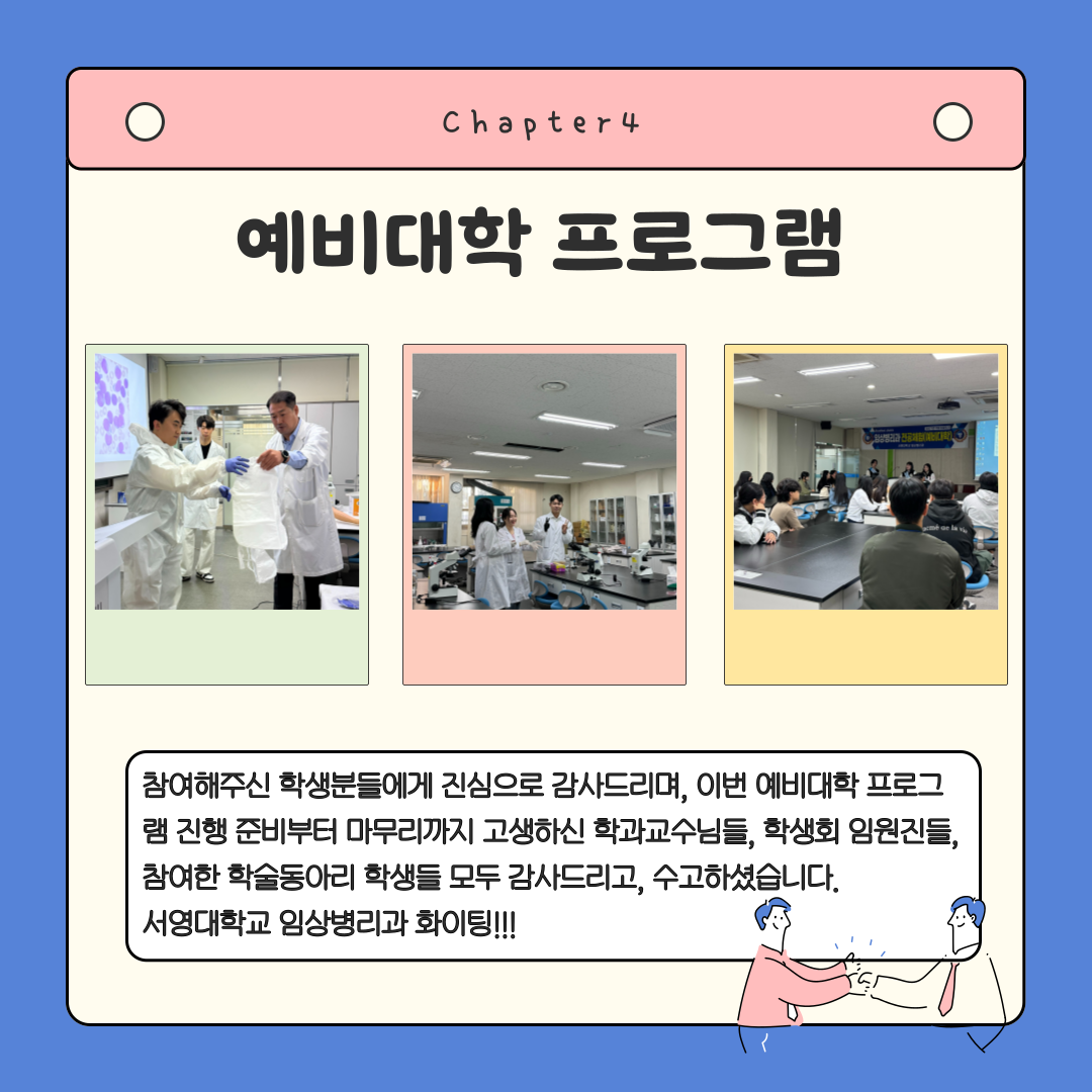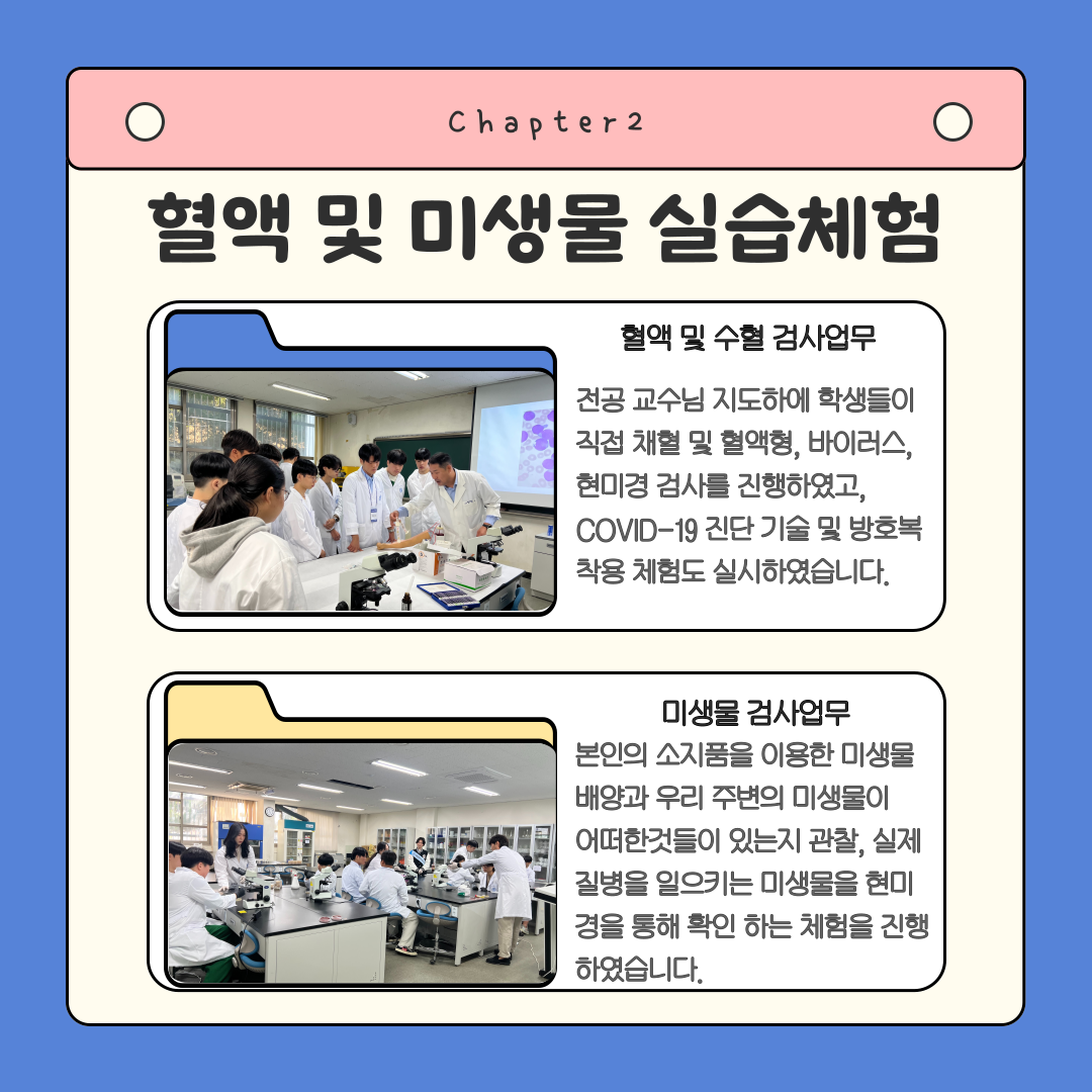 각 실습실에서 임상병리사의 업무(혈액 및 수혈 검사, 조직병리학검사, 미생물검사, 검시조사)를 직접 시연하고, 학생들이 직접 체험해 볼 수 있는 기회를 마련하였습니다. 분야별 검사의 체험활동은 교수님들 지도하에 미생물, 신경생리, 혈액 학술동아리 학생들이 참여하여 더욱 더 큰 의미가 있었습니다. 예비대학 프로그램에 참여한 학생들에게는 소정의 선물 및 간식도 제공하였고, 학생들의 만족도도 매우 높았습니다. 이번 예비대학 학과 체험 프로그램은 안전수칙을 이행하여 아무 탈 없이 성황리에 성공적으로 마무리 되었습니다. 참여해주신 학생분들 에게 진심으로 감사드리며, 이번 예비대학 프로그램 진행 준비부터 마무리까지 고생하신 학과교수님들, 학생회 임원진들, 참여한 학술동아리 학생들 모두 감사드리고, 수고하셨습니다.