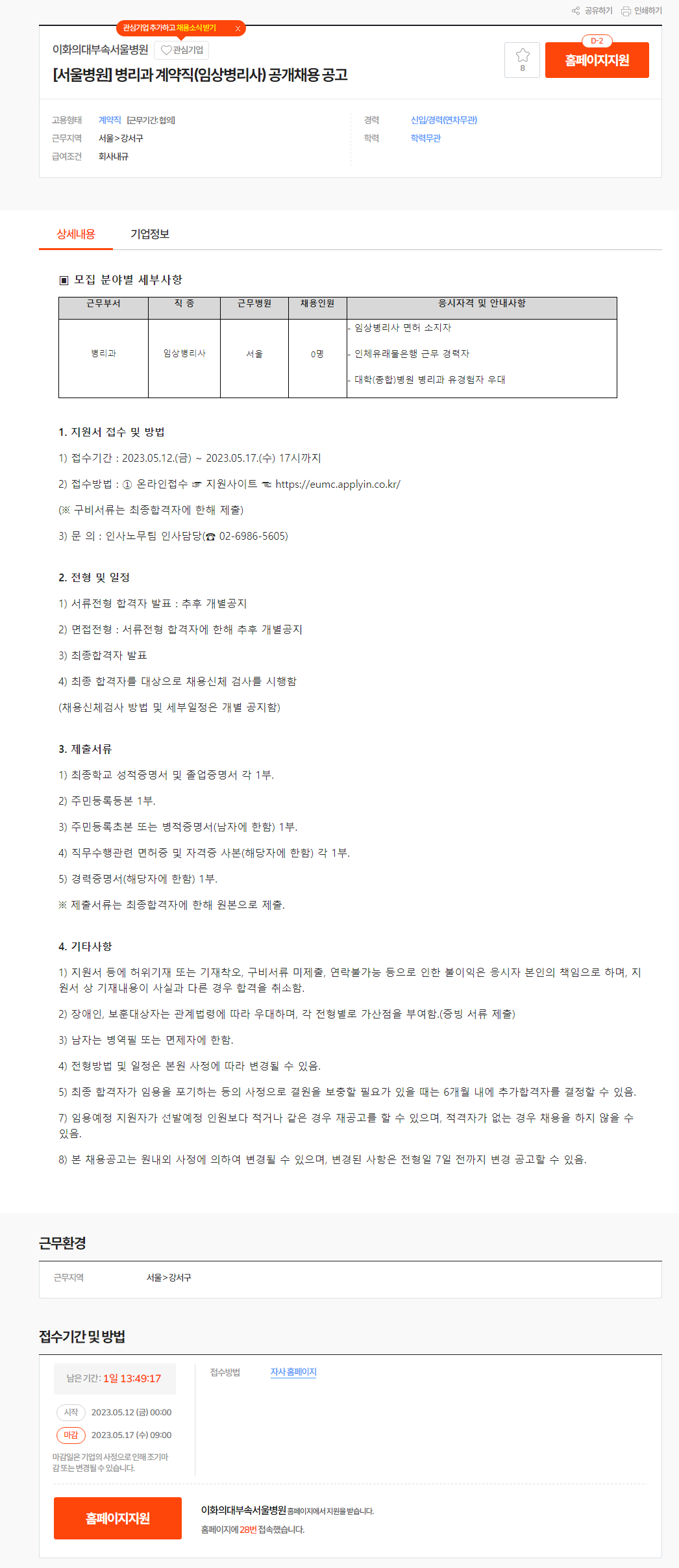 이화의대부속서울병원 채용 : [서울병원] 병리과 계약직(임상병리사) 공개채용 공고 - 인크루트 채용정보 (incruit.com)