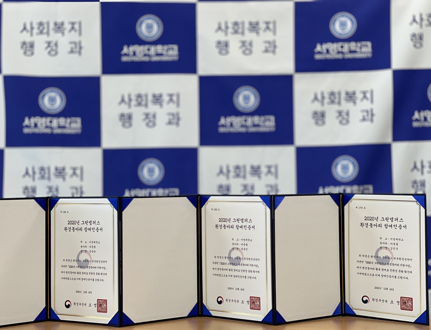 사회복지행정과 '마중물'은 환경부가 주최하고 한국환경공단이 주관한 2020년 그린캠퍼스 환경동아리 지원사업에서 환경동아리 활동 참여로 친환경 문화 확산에 기여하였으며 이에 대한 참여인증서를 수여했습니다.