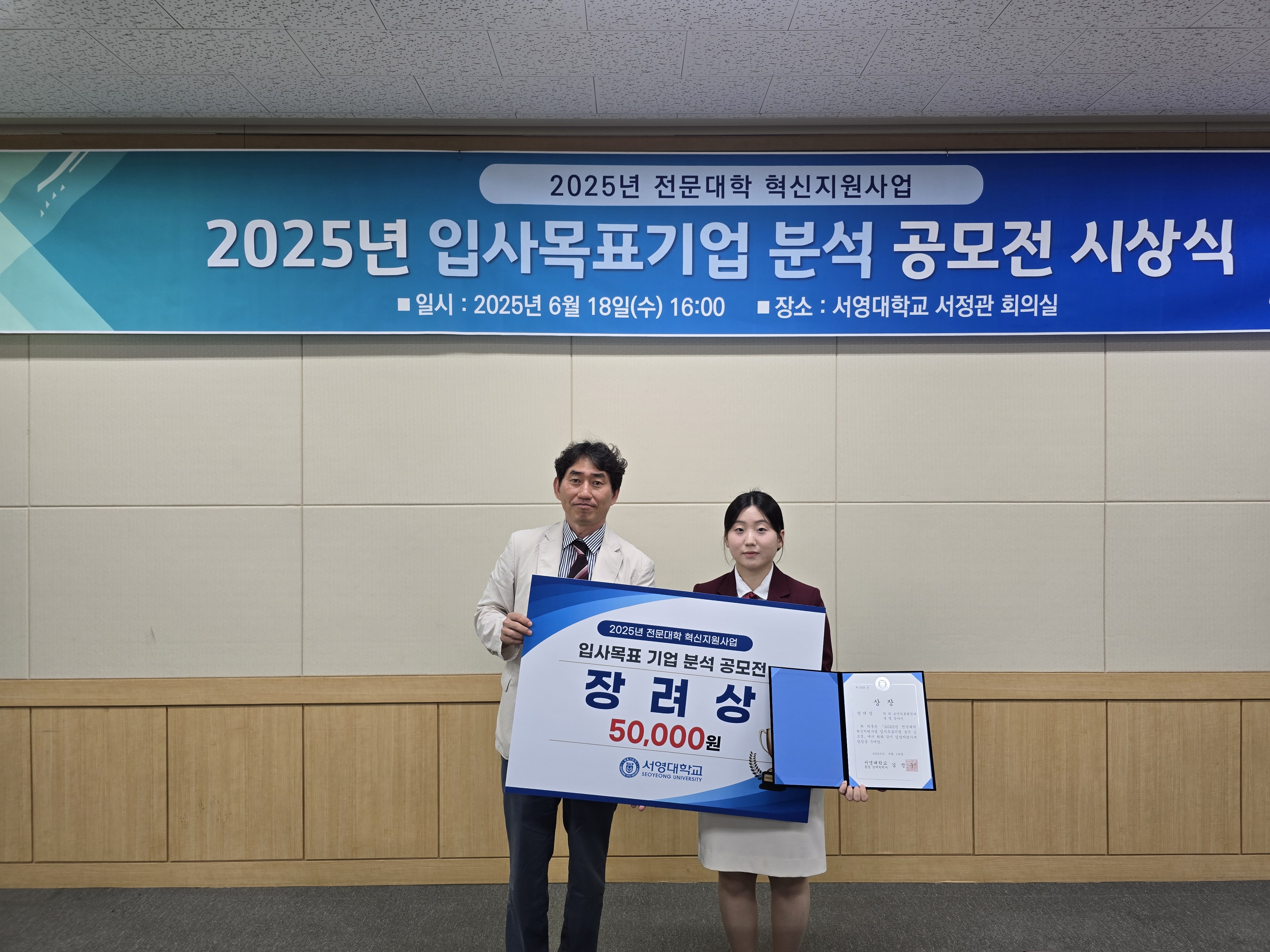 O. 우리대학(총장 김정수) 학생취업처(처장 김명재)는 6월 18일(수) 2025년 전문대학 혁신지원사업의 일환으로 2025년 서영대학교 입사목표기업 분석 공모전 시상식을 진행하였다. 서정관 회의실에서 진행된 행사에는 김명재 취업처장을 비롯하여 학생취업처 교직원 8명과 재학생 수상자 16명 등이 참석하였다.